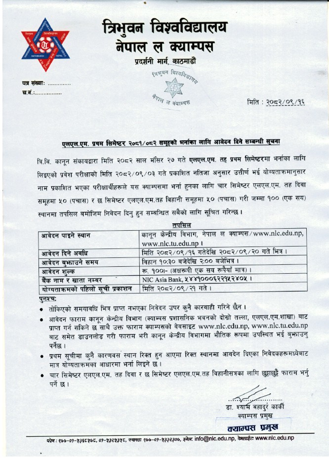 एलएल.एम. प्रथम सिमेष्टर २०८१/०८२ समूहको भर्नाका लागि आवेदन दिने सम्बन्धी सूचना