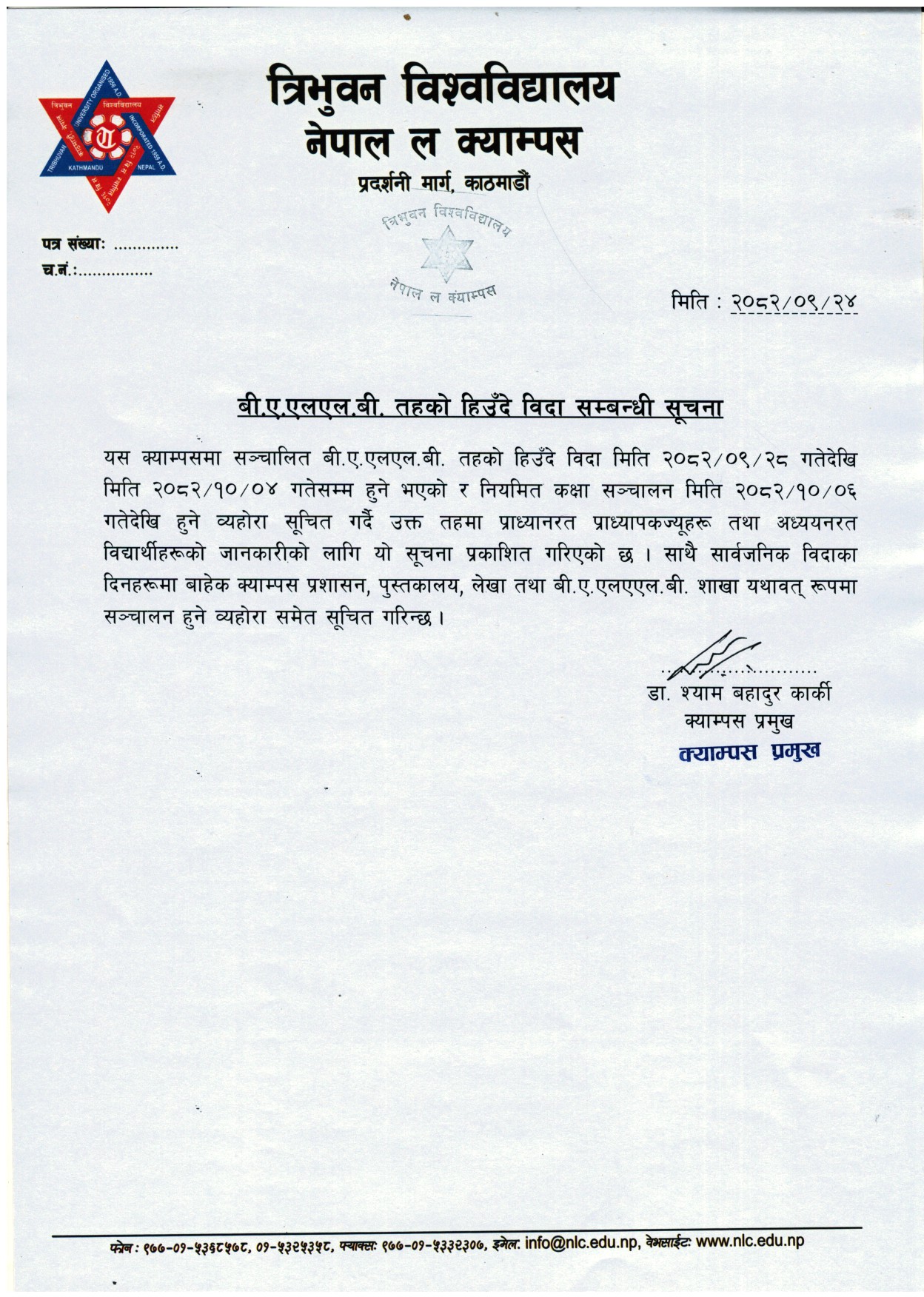 बी.ए.एलएल.बी. तहकाे हिउँदे विदा सम्बन्धी सूचना