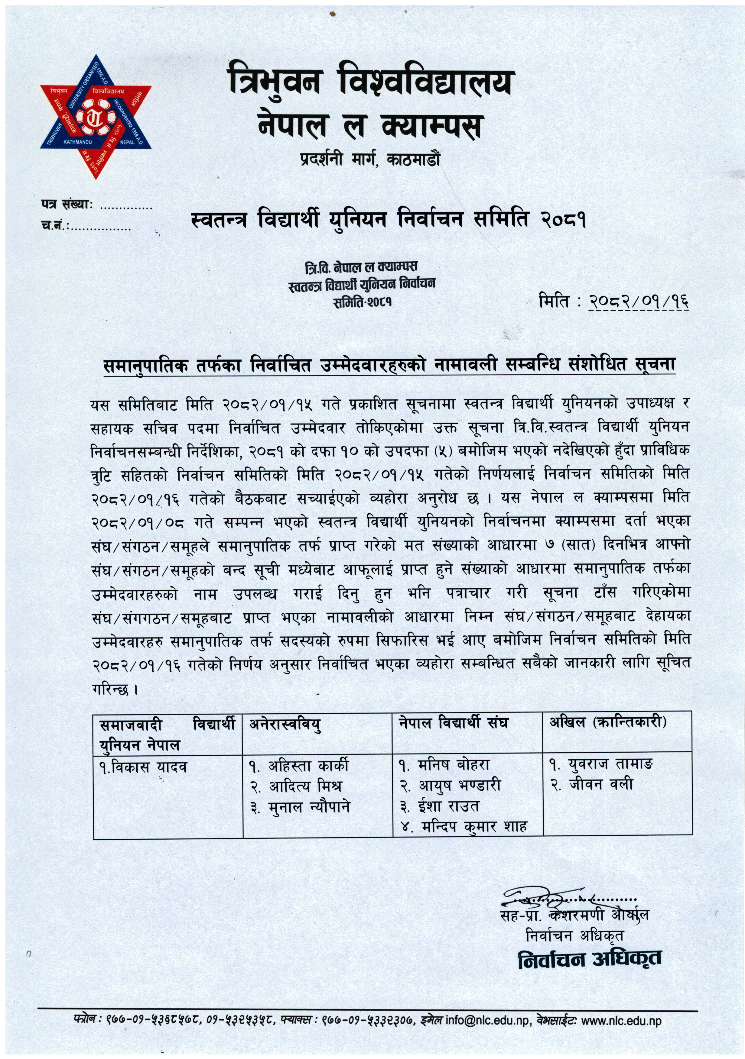 समानुपातिक तर्फका निर्वाचित उम्मेदवारहरुको नामावली सम्बन्धी संशोधित सूचना