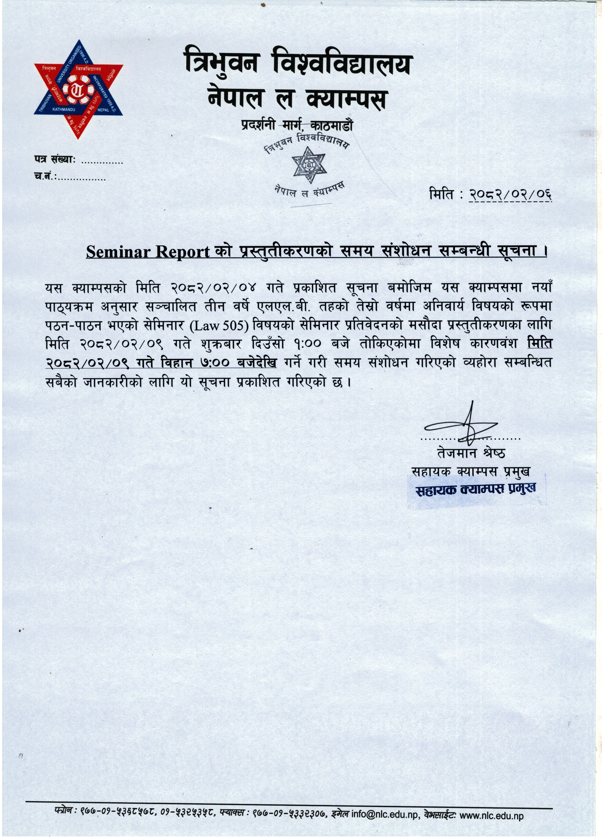 Seminar Report को प्रस्तुतीकरणको समय संशोधन सम्बन्धी सूचना ।