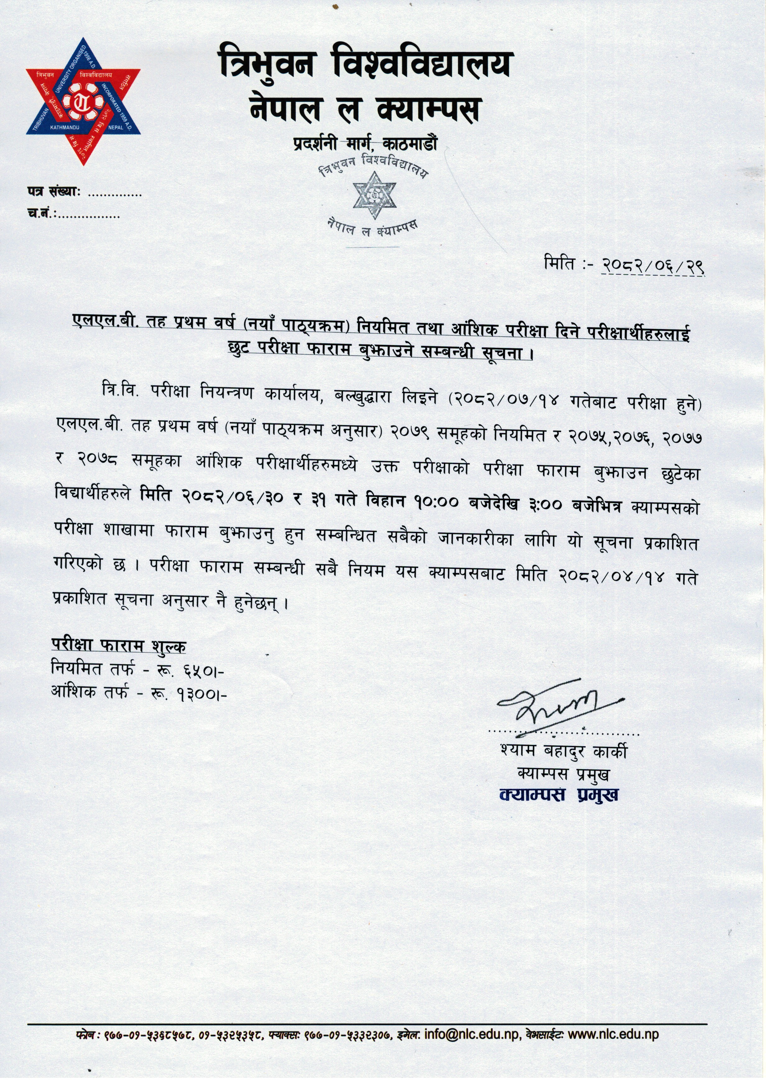 एलएल.बी. तह प्रथम वर्ष (नयाँ पाठ्यक्रम) नियमित तथा आंशिक परीक्षा दिने परीक्षार्थीहरुलाई छुट परीक्षा फाराम बुझाउने सम्बन्धी सूचना