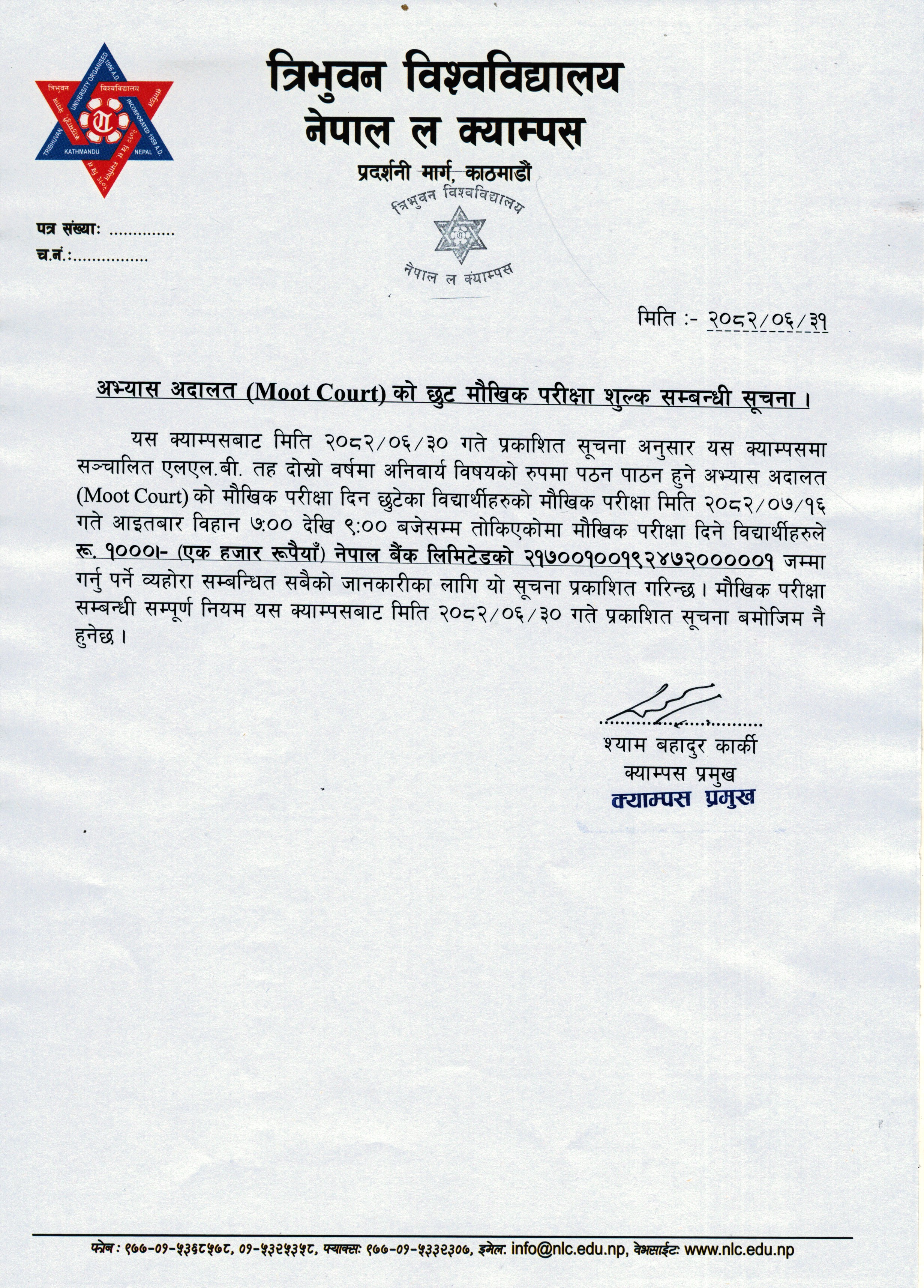 एलएल.बी. तह द्वितीय वर्ष (२०७४ समूहका आंशिक तर्फका विद्यार्थीहरु) को लागि अभ्यास अदालत विषयको मुद्दा तोकिएको सम्बन्धी सूचना ।